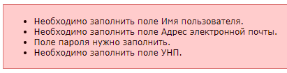 Если вы забыли указать информацию в поле, которое отмечено как обязательное * и нажали кнопку "Зарегистрироваться", форма вернёт ваши данные и подскажет какие поля вы не заполнили.